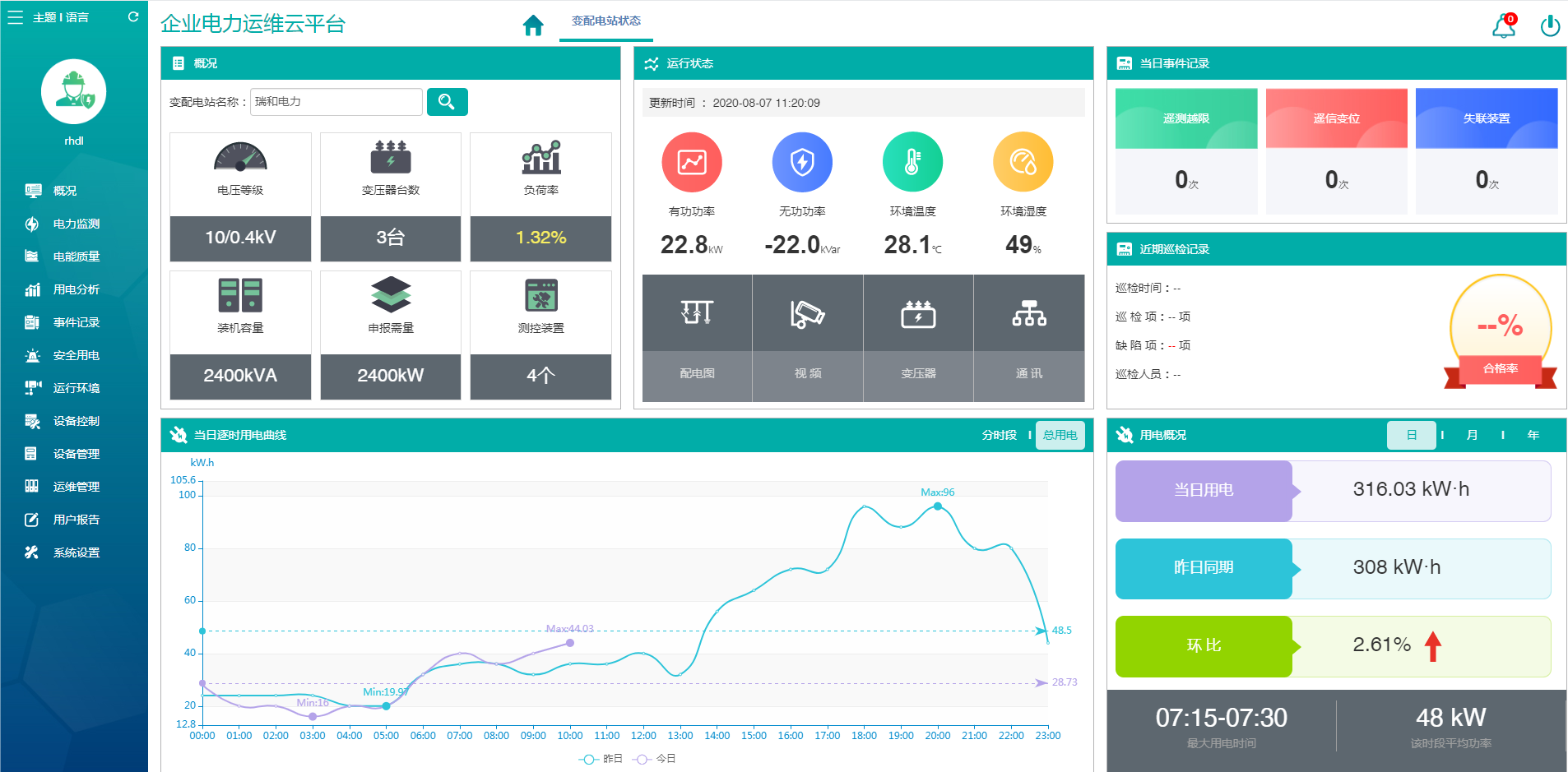 显示变电所的基本信息(电压等级、变压器台数、装机容量、运行容量等)、运行状态(功率、环境温湿度等)、事件信息(遥信事件、遥测事件)、当日用电情况(逐时用电趋势、环比用电情况),所采集的信息可长时间保存。